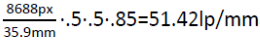 The factor of one half is due to the fact that to record a line pair or complete cycle (white-to-black) two samples are needed. A compensation must be done after that to adjust for the sensor’s own degradations. The Bayer pattern immediately means that of it takes a 2×2 chunk of data to get full color for a single pixel, so we may throw away 50% of what is left. On top of that, if an optical low pass filter (OLPF, anti-aliasing filter) is installed we may take off another 15%. For e.g. the Canon 5Ds we have: