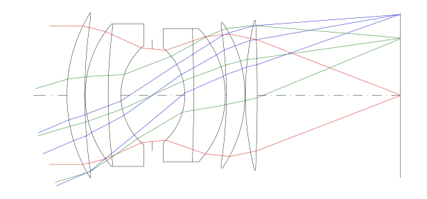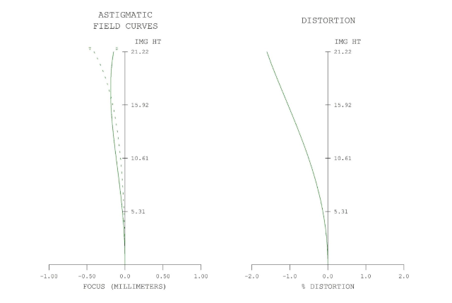 In the lens diagram vignetting may also be seen. The “notches” in the center of the lens are the aperture stop. If it is filled by the rays, there is no vignetting. The blue full-field traces clearly do not fill the stop, so it can be seen that the lens is vignetted. From the field curves it is evident that distortion is reasonably well controlled, and that the lens’ field curvature is decently small, as is the astigmatism.