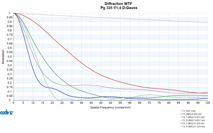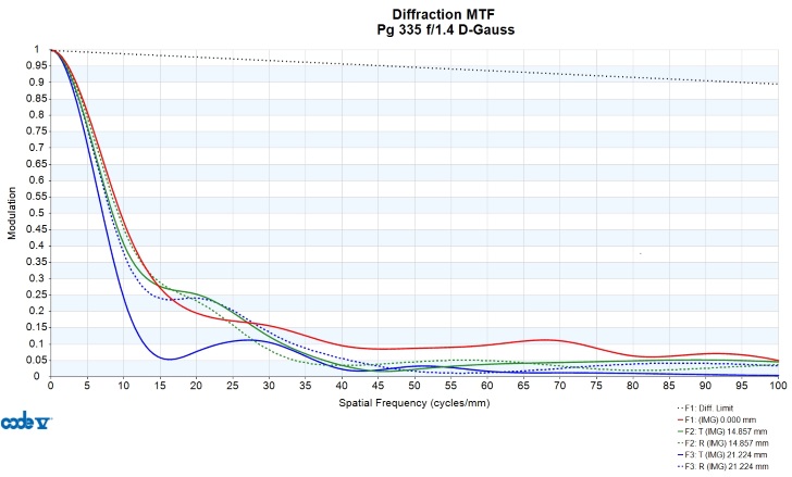 How “fat” the wings are is a good measure for how out of focus the sagittal plane is, while their “width” or length is a measure of how much oblique spherical is present. In the spot diagram the coma is actually mostly invisible because of how much larger the oblique spherical is. In the very center of the full-field plot you see the blur tend towards a “comet” shape – this is coma. Figure 14 is the lens’ MTF, something photographers are maybe more familiar with.