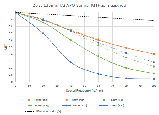 In the case of this 135mm lens, we may observe a drop in the resolution towards the edge, but mostly for the tangential image plane. This, likely indicates that the lens suffers from astigmatism. Astigmatism in lens design is thought of as a difference in the field curvature (Petzval) for the sagittal and tangential planes. Here it appears that the sagittal plane is quite flat, and the tangential plane is curved such that the edges do not fall to the same focus as the center. Referencing the manufacture MTF curves, available here for f/2 it is apparent that one of two situations is the case; either the curves are generated by mounting a sample lens to an MTF bench such as the ImageMaster used to produce this data or an Optikos LensCheck bench and the results are from the medial focus or focal plane of least astigmatism, or Zeiss compensates for field curvatures to produce their MTF curves.