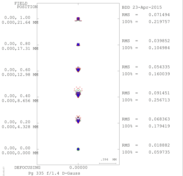 Figure 13 – Spot diagram for the 50mm f/1.4 lens