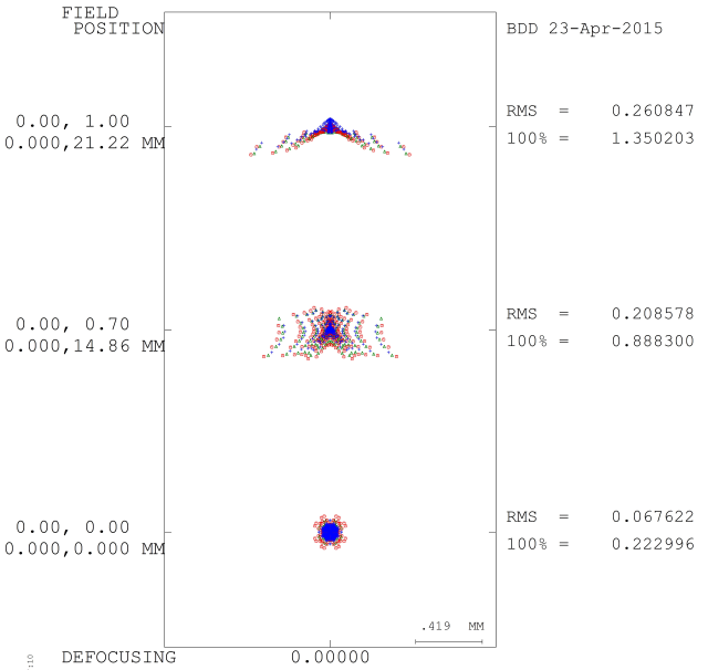 I will point out at this time that the coma in this lens is small and is not the dominant aberration. It is all the rage these days when a new lens is released to check fi it has “coma” by shooting a star field and looking at what the stars look like in the corner of the picture. This is a rather harsh torture test for a lens, since the typically strongly clipped stars present an enormous object-space contrast. The dominant aberration in this lens is oblique spherical by a factor of more than two. Figure 13 shows a spot diagram for the lens. The full field spot may look familiar, it is the internet-famous “wings” – what many review websites label incorrectly as “coma.”