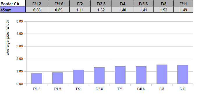 Lateral CAs have an average width between ~0.9 and 1.5px at the image borders. Auto-correction can handle this. Without corrective measures, the CAs would be slightly noticeable on high-megapixel cameras, at least.
