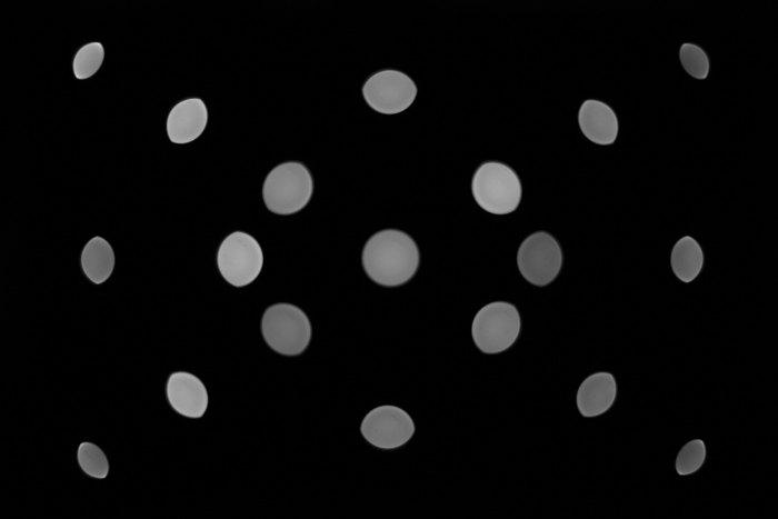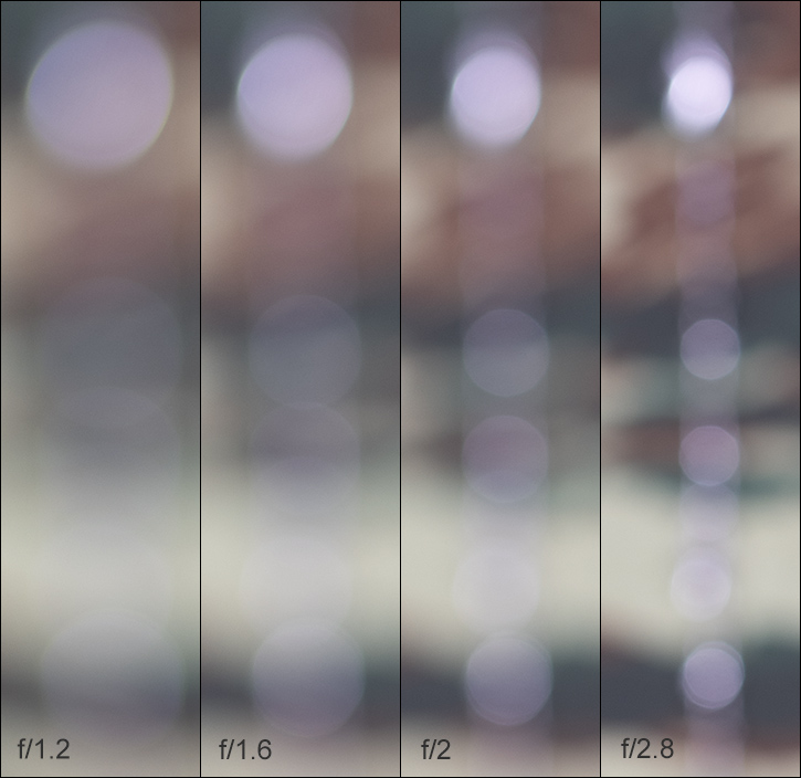 As you can see below, the circular highlight shape is only intact near the image center at f/1.2. It deteriorates rapidly to “cat eyes” the more you look into the image corners. This is a mechanical vignetting effect related to the size of the front element. Stopping down restores the circular shape across the image field, and the highlights are all circular from f/2.8.