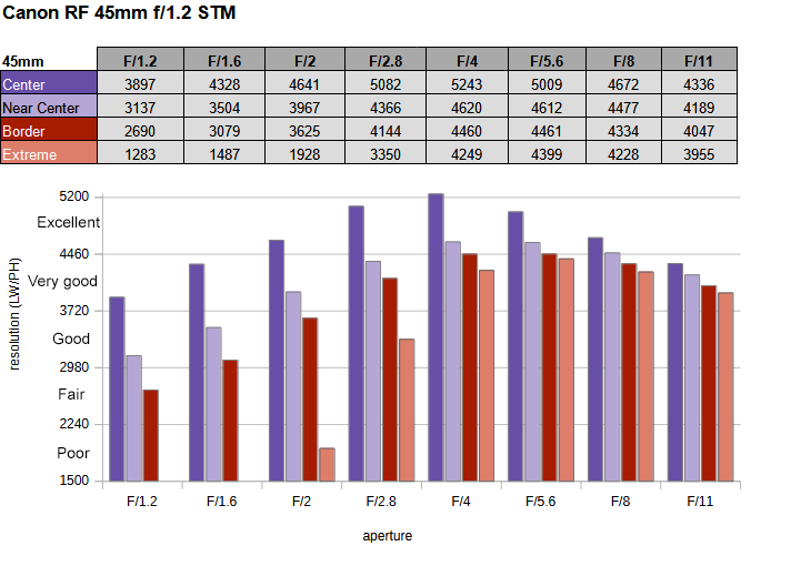 The Canon RF 45mm f/1.2 STM has a -say- “traditional” optical design with just a single aspherical element. They used to make such lenses some decades ago … and it shows. The center quality is okay at f/1.2, although it’s nothing to brag about. There’s a sudden drop beyond the dead center with the near-center already being a bit soft; the border quality is unimpressive, and the corners are rather terrible. Stopping down to f/1.6 lifts the quality a bit, but the corner resolution remains a no-show up to f/2. This changes at f/2.8. The broader center and even the borders become impressively sharp, and the corners emerge from the blur to good quality. There’s nothing to complain about at f/4 and beyond. The lens is perfectly sharp across the image field here until diffraction takes its toll.