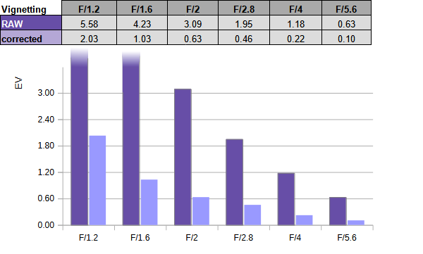 The profile correction (including distortion correction) reduces this to a still high, although not excessive, 2 EV (f-stops) at f/1.2. Stopping down to f/1.6 reduces this further, and the issue is more or less gone from f/2.
