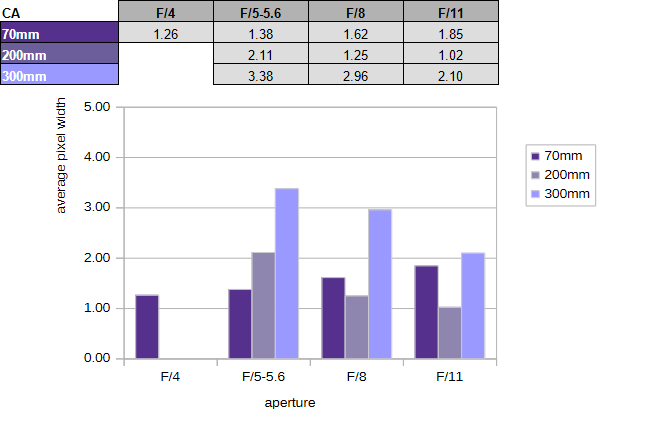 Lateral CAs are an issue at longer focal lengths. At 300mm f/5.6, we detected an average CA pixel width of more than 3px, which is rather poor for a modern lens.
