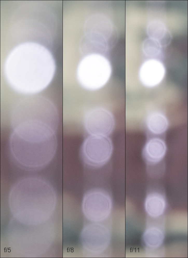 Let’s first take a look at out-of-focus highlights. They are nicely circular at f/5 (in the middle zoom range) and f/8, with just a hint of edginess from aperture shape creeping in at f/11. However, the inner zone of the discs is rather busy, and there’s some strong outlining.