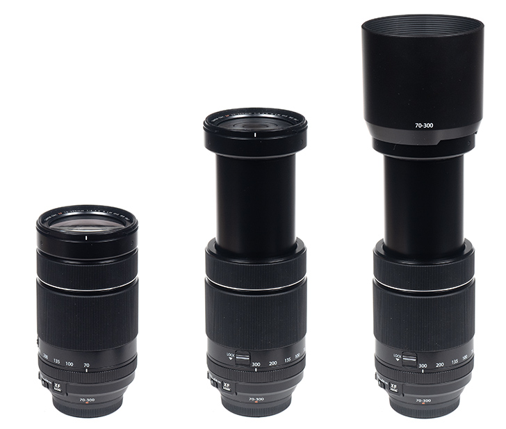 The build quality of the XF 70-300mm f/4-5.6 R LM OIS WR is in line with what you can expect from a consumer-grade zoom lens. The weather-sealed lens body is made of engineering plastics based on a metal mount. The rubberized focus and zoom rings are very grippy. The zoom ring has decent friction to allow for precise zooming, whereas the focus ring turns very loosely. A transport lock is provided to hold the lens in its 70mm position. We didn’t observe any zoom creeping, though. Typical for such lenses, it extends quite a bit when zooming out to 300mm. It is, however, a very compact lens at its 70mm setting. You can choose to operate the aperture in A-mode on the camera or via the (unmarked) aperture ring on the lens. The focus limiter switch allows you to limit the focus range to 5m to infinity, which can be helpful when tracking fast-moving objects. Otherwise, the lens can focus down to just 0.83m or a max object magnification of 1:3 at 300mm – that’s almost macro territory. A deep, barrel-shaped lens hood is provided.