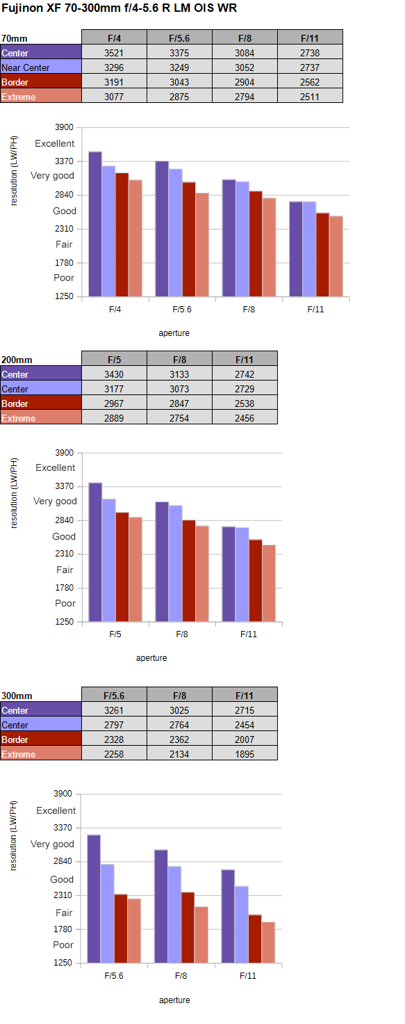 The Fujinon XF 70-300mm f/4-5.6 R LM OIS WR is a comparatively slow lens, which is a bit of a limiting factor. Typically, the APS-C performance peaks at f/2.8 before diffraction effects start to kick in – at least under lab conditions. Even so, the resolution is pretty good at 70mm with excellent center quality at f/5.6 and a very good outer image field. Stopping down doesn’t improve the quality anymore (due to diffraction). The quality is mostly maintained at 200mm. However, there’s a drop in quality at 300mm. The dead center is still very good, but the borders/corners are rather mediocre at f/5.6, and they don’t recover from here.