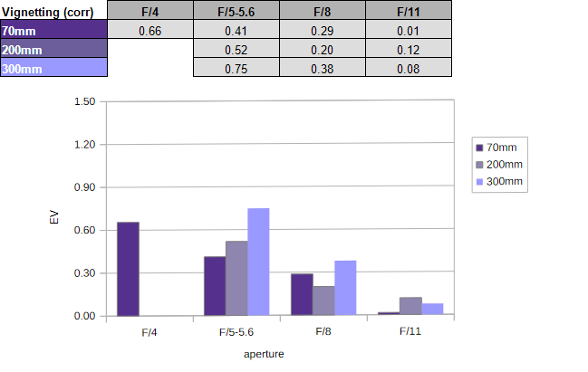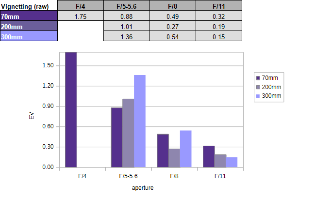 We can see a similar pattern with respect to vignetting. Uncorrected images show a fairly heavy light falloff at 70mm f/4 – at least within the APS-C scope (on full-format cameras, such figures are “normal”). It’s not quite as pronounced in the middle zoom range, but it increases again at the very long end. Stopping down mitigates the issue, as usual.