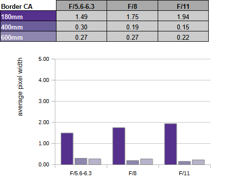 While the lens has the best center sharpness at 180mm, it is also the focal length with the highest lateral CAs. They range between 1.5~2px at the image borders. Surprisingly, the CAs are almost absent at longer focal lengths.