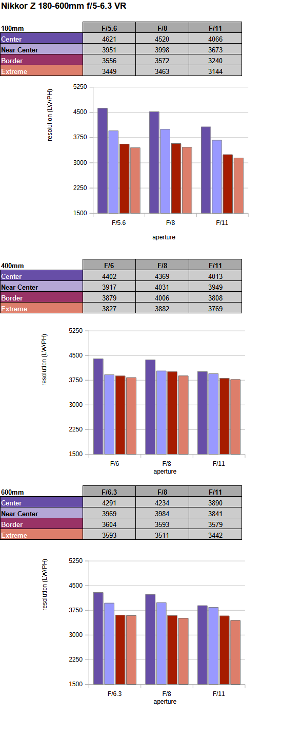 The resolution figures of the Nikkor Z 180-600mm f/5.6-6.3 VR are decent without being truly outstanding – at least on high-megapixel sensors. Overall, the performance is quite consistent. The center quality is generally very good, falling to good results in the outer image field. The lens performs best in the low to mid range, but the quality remains quite high at 600mm. Stopping down doesn’t really improve the quality, and f/11 is affected by diffraction already.