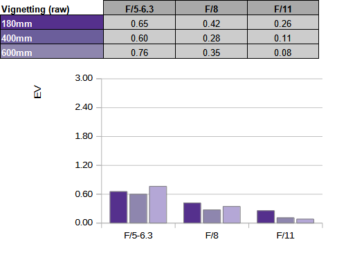 The RAW vignetting of the Nikkor is surprisingly low, with a light falloff around 0.7 EV (f-stops) at maximum aperture. The vignetting is negligible from f/8 already.
