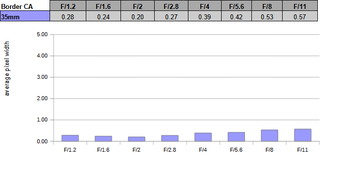 Lateral CAs are extremely low at large aperture settings and increase only slightly from f/2.8 onward. Even at their peak, they don’t reach disturbing levels.