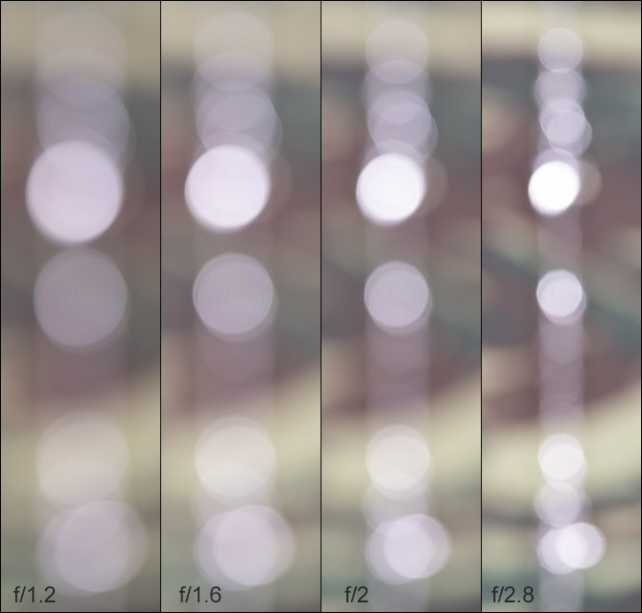 When looking at the highlight rendering across the image field, we can see a slight shape deterioration from the midfield onward at f/1.2. However, even the corner highlights aren’t harshly cut but maintain an almost ellipsoid shape. As usual, stopping down increases the “perfect” zone, although the corner shapes aren’t fully restored until f/2.8.
