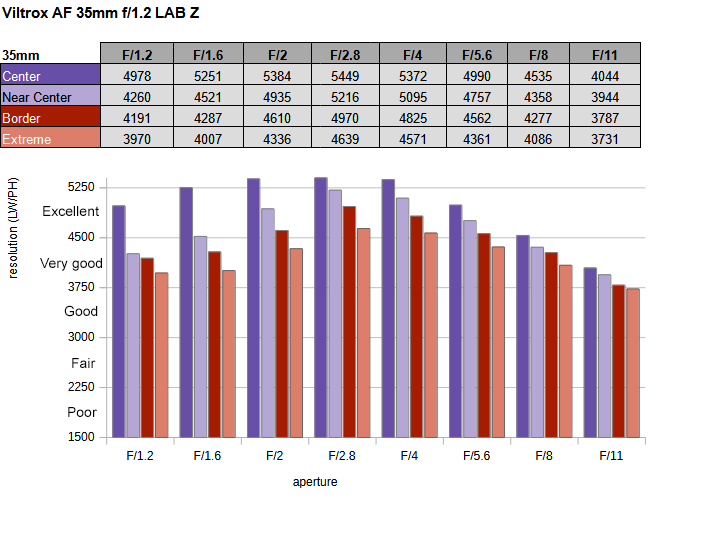 The Z-mount version of the Viltrox AF 35mm f/1.2 LAB Z maintains the general characteristics of what we have seen in E-mount. However, the tested sample is a bit better at large aperture settings. Some variations with lenses this fast are to be expected. Tiny imperfections are more pronounced the larger the aperture. In this case, this is good news with this sample because it already reaches an excellent center quality at f/1.2. The near center and outer image field are also impressively sharp here already. Stopping down increases the quality slightly, and gradually reaching an outstanding peak results between f/2.8 and f/4. Beyond, diffraction is a limiting factor, although it’s not really an issue until beyond f/11 (on high-megapixel cameras).