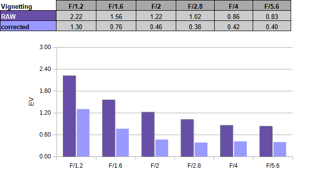 The raw vignetting is normal for an ultra-fast lens. At f/1.2, the light falloff exceeds 2.2 EV (f-stops). Stopping down to f/2 cuts this down by about 1 stop. And it’s acceptable from f/4.