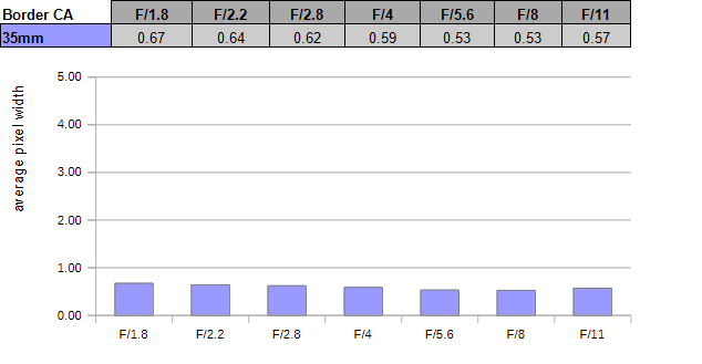 Lateral CAs are low, with an average pixel width around the 0.6px mark at the image borders. That’s usually nothing to worry about, and a good RAW converter should be able to handle this with ease.