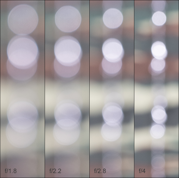 Out-of-focus highlights are nicely rendered near the image center with virtually no outlining and an almost clean inner zone of the discs. The circular shape is maintained up to f/2.8. There’s just a hint of edginess from the aperture shape creeping in at f/4.