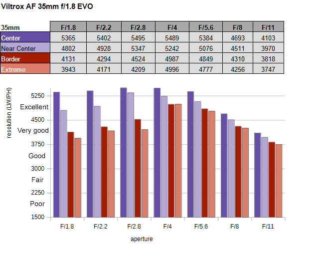 The Viltrox AF 35mm f/1.8 EVO produced very impressive resolution figures in the lab – something to get used to with Viltrox lenses, it seems. The dead center quality is nothing short of outstanding straight at f/1.8. There is a drop in quality the more you look towards the edges, but even the extreme corners maintain very good results. Stopping down to f/2.2 doesn’t change much. At f/2.8, the broader center goes stratospheric, and there’s a slight improvement in the outer image field. The quality is best at f/4, with superb quality across the image field. As is so often the case, diffraction is a limiting factor beyond f/5.6, with a higher impact from f/11.
