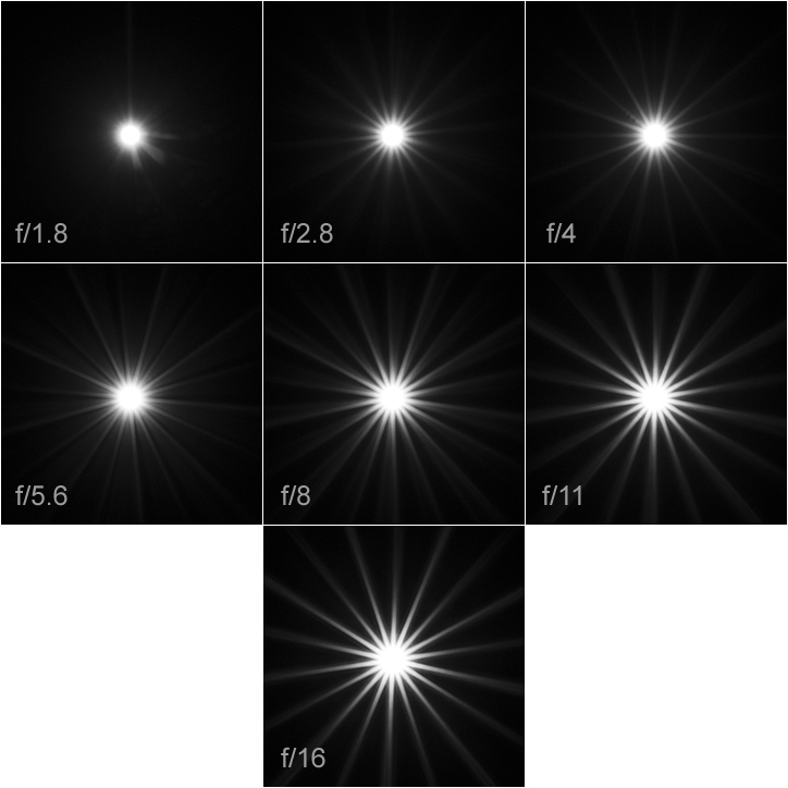 The aperture is fully circular at f/1.8, so a pointy light source is just a “blob” here. However, rays appear already at f/2.8, but they are only really pronounced from f/8 onward, with the best results at f/11 and f/16. The rays are nicely “pointy” (rather than fan-like) – although there are many of them (18) due to the 9 aperture blades.