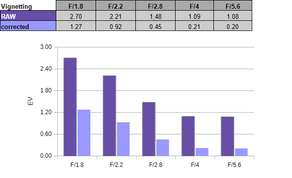 Auto-correction does make a substantial difference here with a reduction of 1.5 EV (f-stops) at f/1.8. In practical terms, the vignetting is mostly gone from about f/2.8.