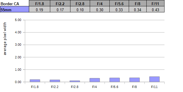 Lateral CAs are very low at all aperture settings, even without corrective measures.