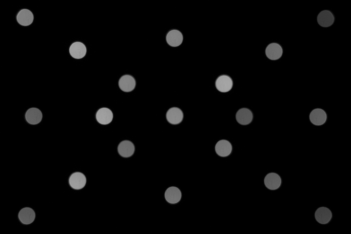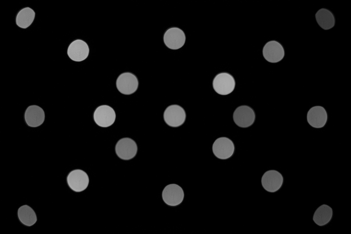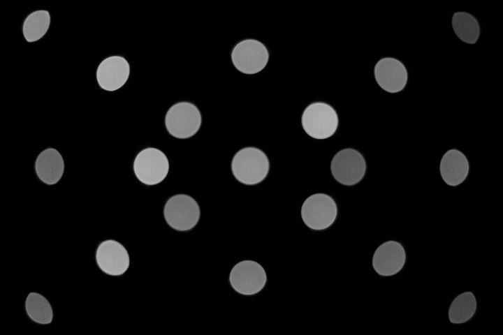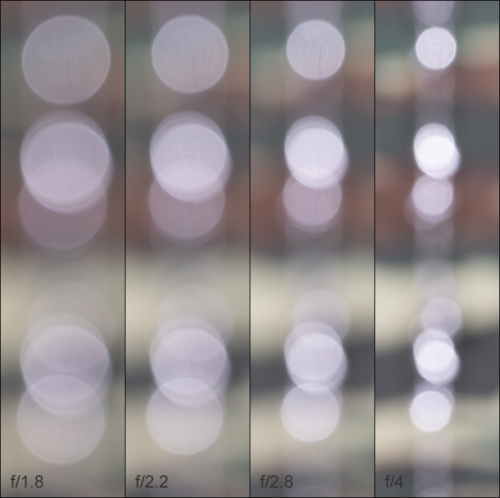When looking at the rendering at f/1.8 across the whole image field, we can observe that the circular shape is maintained in the broader image center. The discs deteriorate from the mid-field, with “cat eyes” visible in the corners. As usual, the zone with circular discs broadens when stopping down. The corner discs are mostly restored by f/2.8.