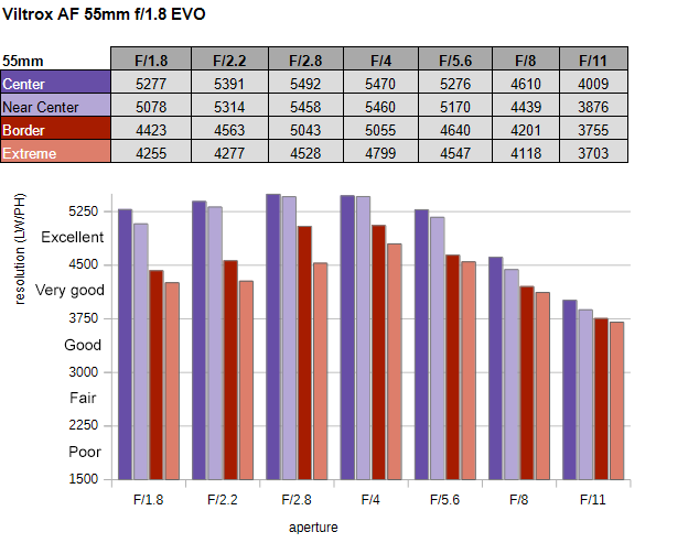 The Viltrox AF 55mm f/1.8 EVO produced excellent resolution results in the lab. The broader center is downright superb at f/1.8 already, and the outer image field is easily very good. Stopping down to f/2.8 raises the bar further. The image center easily exceeds the resolution of the 45 MP sensor, and the border quality is now also excellent. The peak performance is reached at f/4 with superb quality across the image field. Diffraction effects set it beyond f/5.6. f/8 still provides very good quality. At f/11, the quality is more impacted – as usual.
