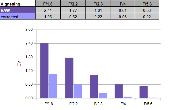 Vignetting autocorrection reduces the issue by more than 1 EV (f-stop) at f/1.8, and the vignetting is almost negligible from f/2.2 already.
