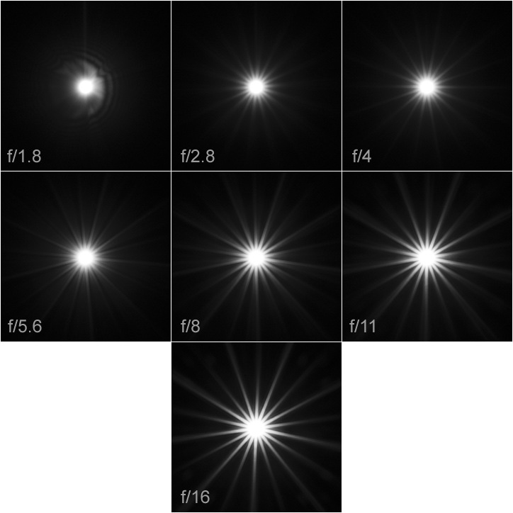 At f/1.8, the aperture is perfectly circular, so strong lights (here an LED) are just rendered as a blob with a bit of haze. At f/2.8, the first rays are showing up. However, for the best results, you should stop down to at least f/8. The rays are nicely spiky. The 9 aperture blades create 18 rays, which is a bit much. However, you can only choose between nice out-of-focus highlights or fewer sun stars, but not have both.
