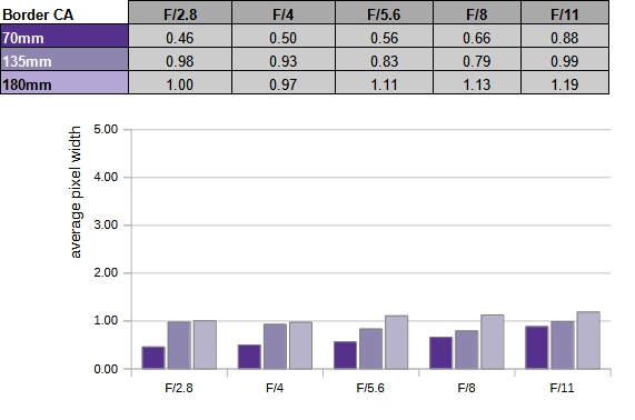Lateral CAs (color shadows at the image borders) are quite well controlled. They are minimal at 70mm, and just visible at longer focal lengths. Stopping down increases the CAs only slightly.