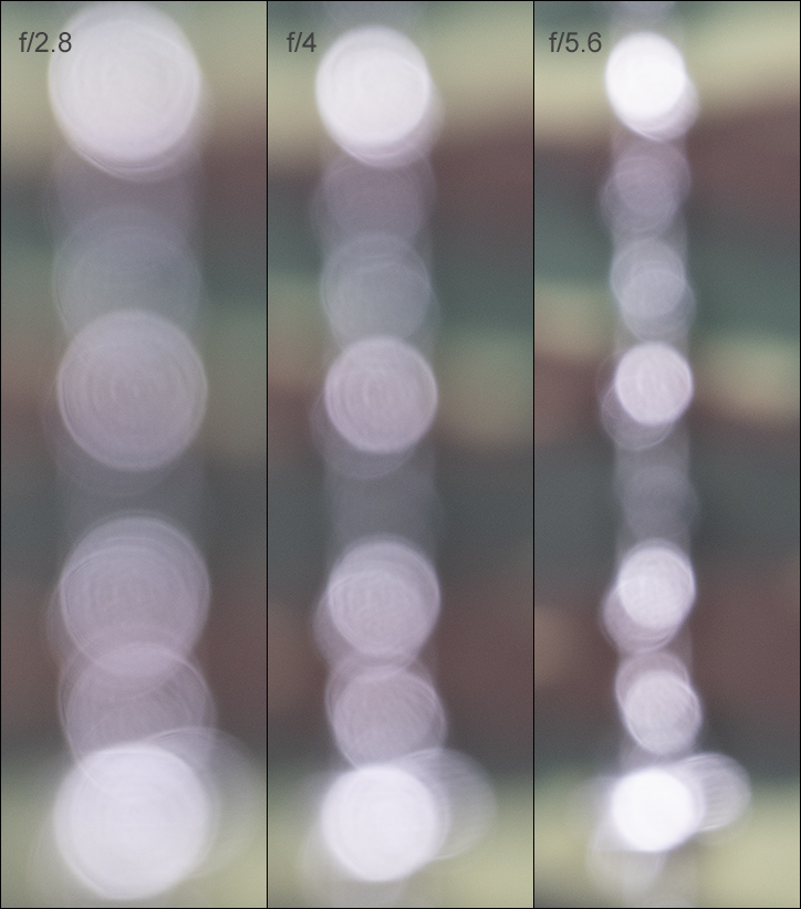 When it comes to out-of-focus highlights, it’s not all sunshine, lollipops, and rainbows, unfortunately. As you can see below, the inner discs have a very distinctively onion-like substructure—probably courtesy of the 2/3 aspherical elements in the lens design. On the positive side, the 9 rounded aperture blades do their job so the circular shape remains intact up to f/5.6.