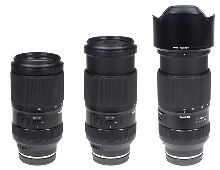 In terms of build quality, there has certainly been an improvement over the previous generation. Having said that, the used materials for the barrel still have a distinctively plasticky feel. Of course, we just don’t know whether this impacts long-term durability – and other manufacturers have adopted engineered plastics long ago as well. We’d still say that it does “feel nice” – take it or leave it. Maybe it’s just a German thing – us Germans do like tanks, after all. Anyway, the two control rings are rubberized at least, and there’s a focus stop button as well as a function switch plus a zoom lock switch. The latter is needed because the zoom action is quite light, and, as you can see below, the lens extends when zooming towards the long end of the zoom range. Tamron has implemented some sealing with a claimed “moisture resistant construction”. The use of lightweight plastics for the lens body has its charm when it comes to the weight. At just 855g, it’s – by quite a margin – the most lightweight lens of its class. It’s also incredibly short at just 156.5mm – that’s more than 4cm shorter than Sony’s FE 70-200mm f/2.8 GM II. The shorter max focal length of 180mm vs the usual 200mm helps here, of course.