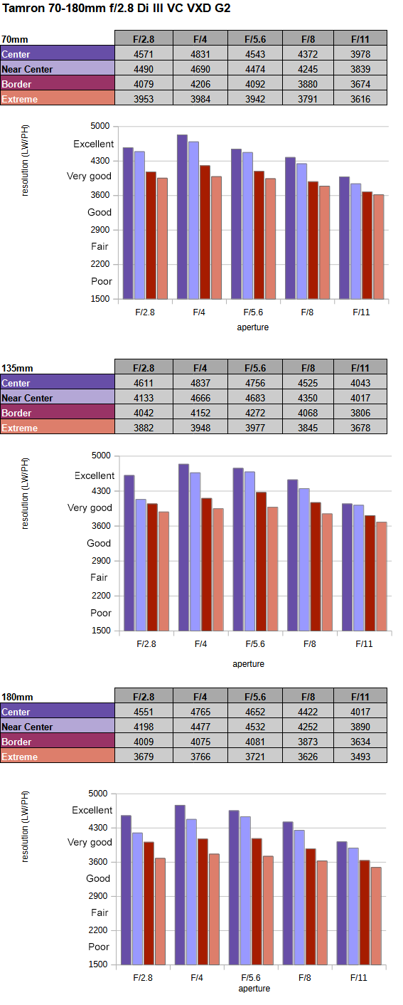 The predecessor of the Tamron 70-180mm f/2.8 Di III VC VXD G2 impressed us quite a bit in the resolution chapter, and the G2 is even a bit better here. At 70mm f/2.8, the broader center quality is already great, and the outer image field is easily very good. Stopping down to f/4 improves the quality a little more. Beyond diffraction is already the limiting factor. The quality is almost the same at 135mm and 180mm – a very consistent performance indeed.