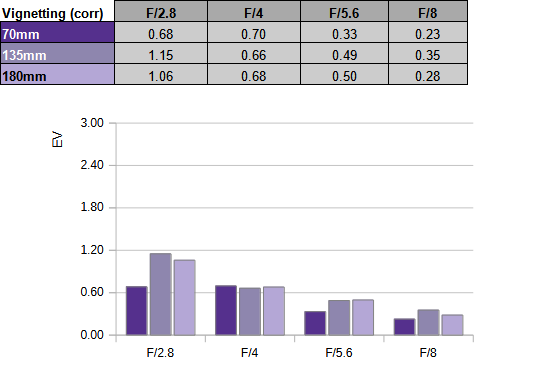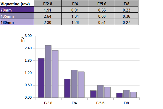 The use of comparatively small glass elements has an impact on the vignetting. In RAW images, the vignetting exceeds 2.5 EV (f-stops) – that’s basically a full stop more than on the Sony FE 70-200mm f/2.8 GM II (…). Stopping down to f/4 helps quite a bit, and the issue is mostly gone from f/5.6.