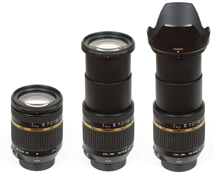 The lens uses a duo-cam zoom mechanism (two inner lens tubes) to extend towards to long end of the zoom range. At 270mm the lens is about twice as long as full retracted (@ 18mm). The tested copy, which has seen some usage already, showed a small amount of wobbling of the inner lens tubes and also suffered from zoom creeping throughout most of the zoom range. To help against the latter, Tamron implemented a switch that locks the lens in the shortest (18 mm) setting. Ironically, that's about the only setting were the tested sample did not suffer from creeping anyway.