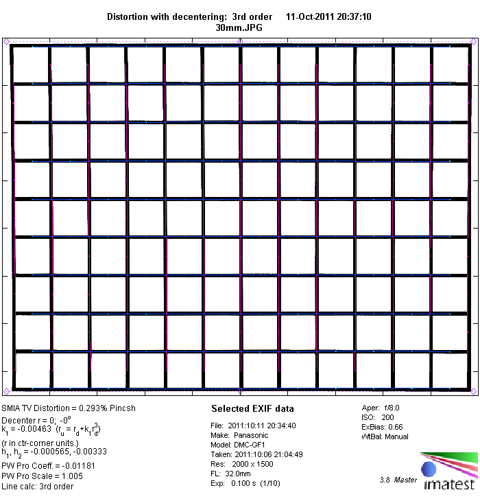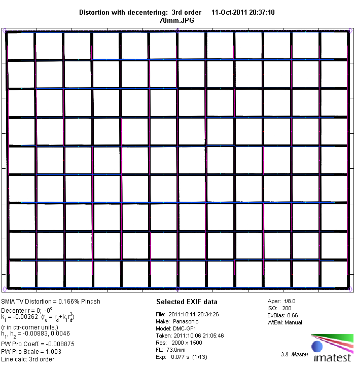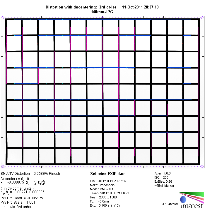 The image distortion produced by micro four-thirds images is auto-corrected either directly in the camera (JPEGs) or in most RAW-converters. The "exposed" distortion is therefore very moderate especially for an ultrazoom. It ranges from a moderate (~1.78%) barrel distortion at 14mm to marginal (0,06%) pincushion distortion at 140mm. This is nothing to worry about from a field perspective.