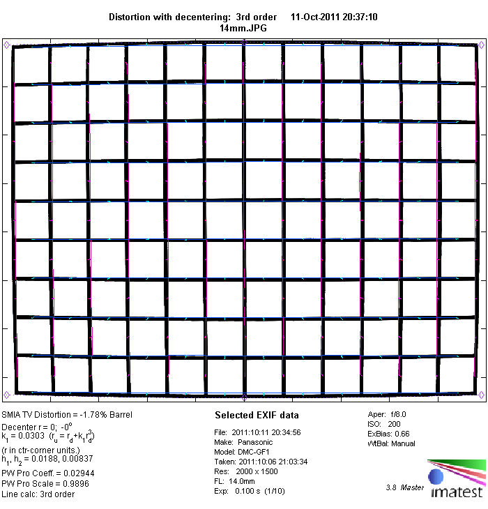 However, the non-corrected raw images show a pretty different situation with an extreme (~6.16%) barrel distortion at 14mm as well as slight (0.52%) barrel distortion at 140mm.